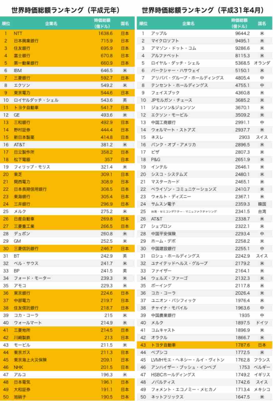 平成元年の世界時価総額ランキングでは、日本の企業は、トップ10に7社がランクインしていましたが、昨年は、0社となり、トップ50に入ったのは、トヨタ自動車(46位)だけです。
