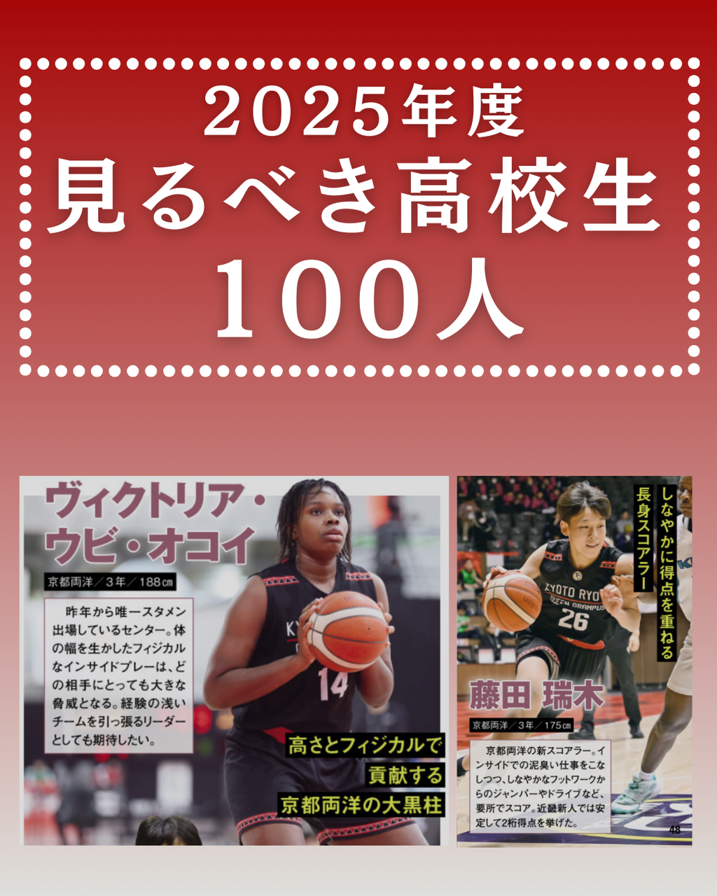 月刊バスケットボールの特集『全国の注目プレイヤー100人(男子50名・女子50名)』において、